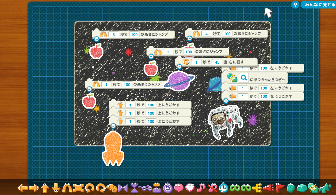 ☆プログラミン 文部科学省 Category:おすすめサイト Date:2016年06月17日 自分で描いたイラストを動かすことも出来ますし、音も鳴らすことが出来るので アニメやゲームが簡単に作れます。 絵を組み合わせるだけなのでより直感的に学ぶことできます。